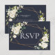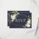 Moderno e moderno, este convite de casamento RSVP design apresenta um falso geométrico de cobre embelezado com cor d'água branca floral e eucalipto verde floral, sobre uma moderna textura azul marinho. Esta é a opção de não comer. Parte de um jogo de casamento. Convidados Elegantes de Direitos Autorais. Todos os direitos reservados.