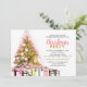 Elegantes convites de festas de natal, com uma árvore de natal esboçada com bolinhos cor-de-rosa e dourados e um conjunto de presentes decorados com pinks e dourados, e um moderno modelo festivo.
