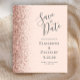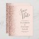 A borda esquerda deste elegante casamento moderno salve o cartão de data apresenta um rosa dourado falso borda brilhante. O texto personalizável combina a escrita manual de cinzas de carvão, fontes em copperplate e itálico em um fundo cor-de-rosa pincelado. O verso apresenta um design cor-de-rosa-pincel e rosa dourado correspondente.
