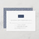 Elegantes, sofisticados e modernos, estes cartões de resposta de casamento ultra modernos apresentam "RSVP" inserido em um elemento retangular que pode ser personalizado com um clique para combinar com as cores do seu casamento. Adicione a data de RSVP desejada, textos de aceitação e declínio e um campo para o número de acompanhantes em letras sem serifa modernas em cinza carvão, depois ajuste a cor de acordo com sua preferência usando as instruções fáceis abaixo. O verso dos cartões apresenta um padrão opcional de chave grega moderna. Mostrado em azul clássico e branco.
