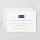 Elegantes, sofisticados e modernos, esses cartões de resposta de casamento ultra modernos apresentam "RSVP" inserido em um elemento retangular que pode ser personalizado com o clique de um botão para combinar com as cores do seu casamento. Adicione a data de RSVP desejada, textos de aceitação e declínio e um campo para o número de acompanhantes em letras sem serifa modernas em cinza carvão, depois ajuste a cor de acordo com sua preferência usando as instruções fáceis abaixo. O verso dos cartões apresenta um opcional padrão de chave grega moderna. Mostrado em azul clássico e branco.