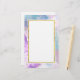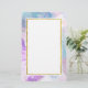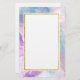Papel de carta com uma bela pintura artística. Criado com tintas alcoólicas correntes. Cores roxas, verdes e azuis fluindo juntas. Fitas onduladas finas de ouro entrelaçadas com estas cores suaves. Um retângulo branco com uma borda falsa de folha de ouro colocada sobre cima para você escrever dentro.