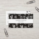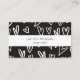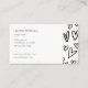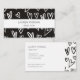 Saia com o cartão de visita artístico artístico com corações de padrão sem soldadura desenhadas à mão sobre um fundo preto com retângulo branco no meio segurando um monograma em fontes modernas minimalistas. O verso tem todas as suas informações pessoais na mesma fonte esquerda alinhadas com corações negros na borda branca de fundo à direita.