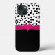 Mala inteligente e giro para iPhone projetada com um símbolo cardíaco cor-de-rocha cor-de-rosa brilhante impresso digitalmente e fita falsa juntamente com o padrão moderno de bolinhas preto e branco para cobrir seu celular em estilo.