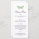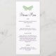Uma borboleta verde delicada acentua este cardápio de casamento.