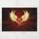 Coração vermelho brilhante de um anjo com asas ouros brilhando no fundo vermelho-radiante escuro decorado com um padrão.