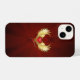 Coração vermelho brilhante de um anjo com asas ouros brilhando no fundo vermelho-radiante escuro decorado com um padrão.