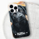 Capa de telefone com a foto personalizada de seu animal de estimação com o nome do animal de estimação como uma sobreposição de texto branca flanqueada por dois corações.