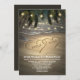 Beach Shore Hearts in the Sand Wedding Invtions - apresenta um belo design de luzes cintilantes penduradas por palmeiras e uma praia elegante com corações de areia que você pode personalizar para si mesmo por mais singularidade. A design também apresenta um fundo litoral de praia com ondas.
