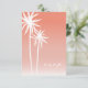 Um rsvp de casamento de praia único com uma ilustração de duas palmeiras brancas à esquerda sobre um fundo de coral ombre.