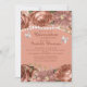 Convite de aniversário de Quinceañera para meninas com lindas, elegantes pessegueiros e flores coloridas de coral, borboletas prateadas e luzes de cordas reluzentes.