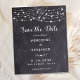 Reserve a Data! Anuncie o seu casamento a amigos e família com estes cartões salve a data rústicos de 'chalkboard' e 'strings light'. Personalizar com nomes, data do casamento, localização. Estes cartões postais de convite para casamento de orçamento precisam ser enviados como cartões postais de tamanho excessivo, de modo que podem incorrer em despesas de correio, mas não precisam de um envelope ou etiqueta de endereço de retorno. Esse casamento exclusivo, salvando as cartas, vai causar uma impressão duradoura, seus hóspedes vão se certificar de salvar a data! COPYRIGHT © 2020 Judy Burrows, Black Dog Art - Todos Os Direitos Reservados. Corda de Orçamento Luzes de Casamento Salvar a Carrinha de Data