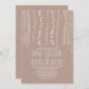 Uma corda rústica de luzes, convites de casamento para o seu casamento vintage moderno no celeiro, rancho ou alojamento. Convite totalmente personalizável - você pode alterar o estilo da fonte, a cor, mover as linhas de texto e gravar no verso também. O fundo tem uma textura de madeira e pequenas luzes cintilantes embelezando apenas perfeitos países rústicos convidados para o casamento com luzes de cordas na cerimônia de pancada. A fonte é bonita, moderna e casual!