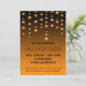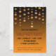 Convite para festas de Halloween com lanternas de jack o' em cordas com um dramático fundo laranja e preto. No outro lado da placa há um padrão de verificação preto e laranja.