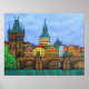 Pintura vibrante e estilizada de bela Praga e da Ponte Charles ao longo do rio Vltava, em Praga, República Checa, pela artista popular Lisa Lorenz.