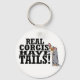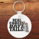 Um cargueiro azul Cardigan Welsh Corgi está agitando a cauda enquanto ele se inclina no texto, "Corgis Real Tem Caudas!" O chaveiro de corgi engraçado é perfeito para o dono do cardigan.