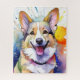 Uma imagem de arte digital de um Corgi vibrante com ouvidos grandes e expressivos e uma expressão feliz domina a imagem, rodeada por cinzas coloridas de água. O plano de fundo apresenta explosões dinâmicas de azul, amarelo e laranja, acrescentando uma sensação divertida e enérgica.