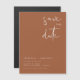 Esta imã salve a data apresenta uma fonte bem escondida escrita à mão e uma design minimalista moderna. Edite facilmente o texto *maioria* para atender às suas necessidades e edite todas as cores de seu gosto. A combinação de cor de laranja queimada pelo tom da Terra boêmica faz dela a adição perfeita ao seu boho, deserto ou casamento terrestre.