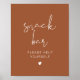 Este sinal de bar de snack apresenta uma fonte escura manuscrita e um design moderno minimalista com uma combinação boho terracotta e cor branca. Altere facilmente as cores da fonte e a cor do plano de fundo para corresponder ao estilo do evento. Par com itens adicionais da Coleção CORIANDER para uma aparência coesa.