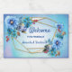 Molduras de ouro geométricas decoradas com um buquê misto de flores azuis, em cor d'água, com botões vermelhos e folhas verdes ouros para personalizar