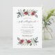 Este convite simples e elegante para um brunch pós-casamento apresenta ramalhetes estilizados em aquarela, compostos por folhagens modernas e flores de Natal vermelhas e brancas sobre um fundo branco. O verso do convite apresenta uma coroa de Natal estilizada e combinando. Perfeito para uma recepção pós-casamento ou almoço de recém-casados.