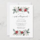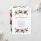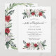 Este convite simples e elegante para brunch pós-casamento apresenta buquês estilizados em aquarela, compostos por folhagens modernas e flores de Natal vermelhas e brancas sobre um fundo branco. O verso do convite apresenta uma coroa de Natal estilizada e combinando. Perfeito para uma recepção após o casamento ou almoço de recém-casados.