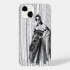 Esta é uma ilustração na moda a preto-e-branco que apresenta uma mulher envenenada num vestido dramático, fora do ombro, com embelezamentos florais intrincados e uma capa brilhante e fluente. O fundo tem uma textura vertical impressionante, acrescentando uma sensação de profundidade e movimento