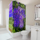 A cortina de chá roxa, azul e verde desenhada por Abstrato foi criada de uma fotografia colorida de flores roxas com folhas verdes brilhantes. Por celeste@khoncepts.com