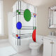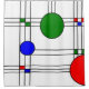 Esta cortina de chá tem um design de janela de vidro colorido deco de arte, de linhas pretas e quadrados e círculos vermelhos, azuis e verdes.