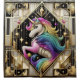 Turn your bathroom into a bold statement piece with this Art Deco–inspired unicorn shower curtain. Featuring a striking black and white geometric background accented with luxe gold detailing, the design channels vintage glamour with a modern fantasy twist. At the center, a majestic unicorn with flowing rainbow hair shimmers with faux-glitter effects, adding vibrant color and magical flair without the mess of real glitter.
