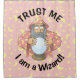 Um velho feiticeiro com capa rosa olhando para a bola mágica de cristal.