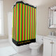 Bandeja rasta colorida vermelha, amarela e verde, cortina de chá do banheiro listrado. Na parte inferior está a citação 'Bem-vindo ao mi batirum', que é personalizável para que você possa adicionar seu próprio texto, ou excluir se preferir