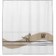 A shower curtain with my simple and modern looking horse shape design with black, beige and white stripes, plus initials.