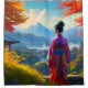 Uma composição surrealista de uma linda mulher asiática olhando para fora e lago cercado por montanhas.