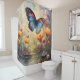 Uma borboleta grande, azul e vermelha veleja entre as flores que enfileiram um riacho num dia nublado nesta cortina de chá impressionante.