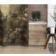 pintura botânica vintage de três pavões num jardim inglês cercado por flores pastel