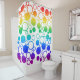 Esta cortina de chá apresenta um desenho dramático de círculos e linhas concêntricas que se parecem um pouco com bolhas Cheias de cores do arco-íris começando com vermelho no topo do blues no meio e roxo no fundo. O fundo é branco. É um belo olhar em um banheiro limpo que tem cores boas no arco-íris.