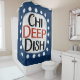 Um design de mensagem tipográfica divertido e fofo que diz "Chi Deep Dish". Ele tem texto preto e vermelho em um retângulo branco com pontos brancos engraçados e brincalhões ao seu redor, tudo em um fundo azul.