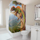 Esta cortina de chá tem um lagarto de dinossauro nela.