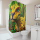 Esta cortina de chá tem um dinossauro fotografado nela.