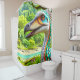 Esta cortina de chá tem um dinossauro nela.