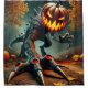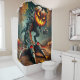 Esta cortina de chá tem um dinossauro de abóbora nela.