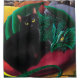 Gato negro se abraçando em um travesseiro burlando entre outros travesseiros atrás com um amigo dragão verde.
