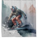Uma peça de mídia mista com um esquiador de snowboard detalhado e uma cena de montanha em aquarela.