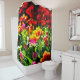 Campo de tulipas coloridas. Lâmpadas multicolores, jogo de luz e sombra. Banquete de cores brilhantes e beleza das flores de primavera. Simulada pintura a óleo a partir de uma fotografia. Cortina de chá para decorar seu banheiro por diversão e bom humor.