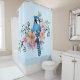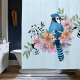 Um pássaro azul rodeado por flores de primavera cor rosa, púrpura e pêssego colorido colorido contra um pano de fundo azul claro.