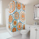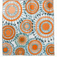 Essa cortina de chá tem um design de anéis e círculos em tons de laranja com linhas de lacre atrás deles formando flores em um campo de branco.