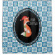 Cortina de chá com uma ilustração fofa cor de laranja, dentro a oval preta. Ele está vestindo um chapéu de anã vermelho e tem sotaques decorativos verdes festivos na cauda e no peito. Feliz Natal também está escrito dentro do quadro oval. O fundo é um padrão com flocos de neve azul e branco.