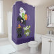 Uma cortina chá com um morcego voador preto, um morcego múmico verde vestindo bandagens brancas e um gato preto giro com um chapéu de bruxa laranja. Boo escreveu em letras coloridas divertidas com um fantasma feliz flutuando para trás.