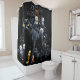 Um gato preto brilhante com olhos amarelos parados com uma pilha de gatos atrás dele.